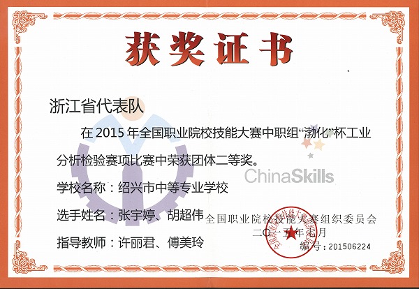 张宇婷、胡超伟荣获2015年全国职业院校技能大赛中职组工业分析检验赛项二等奖