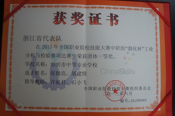 张微亮、屠建情同学荣获2013年全国职业院校技能大赛中职组工业分析与检测赛项一等奖