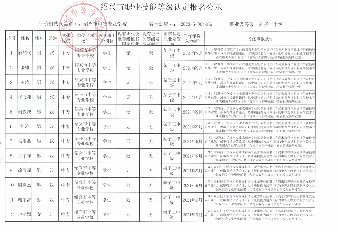 2023年绍兴市中等专业学校5月份第2次架子工中级工报名公示 来源: 作者: 发布时间:2023-05-15 浏览次数: 次 【字体:小 大】 2023年绍兴市中等专业学校5月份第2次架子工中级工报名公示