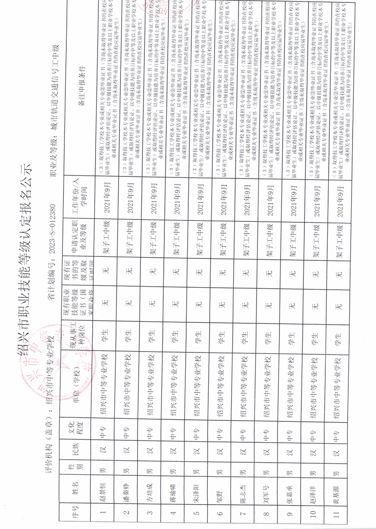 2023年绍兴市中等专业学校12月份城市轨道交通信号工中级工资格审查通过公示