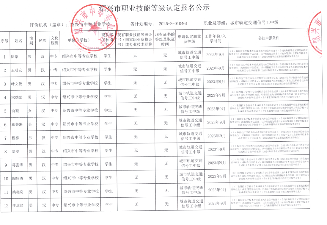 2025年绍兴市中等专业学校12月份城市轨道交通服务员(城市轨道交通站务员)中级工报名审核通过公示 来源: 作者:撰稿人和审稿人:实训处 发布时间:2025-12-20 浏览次数: 次 【字体:小 大】