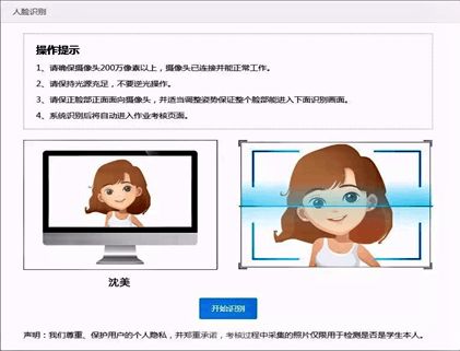 2、“人脸识别”认证必须是学生本人,如不是学生本人将无法识别,不能进行答题;