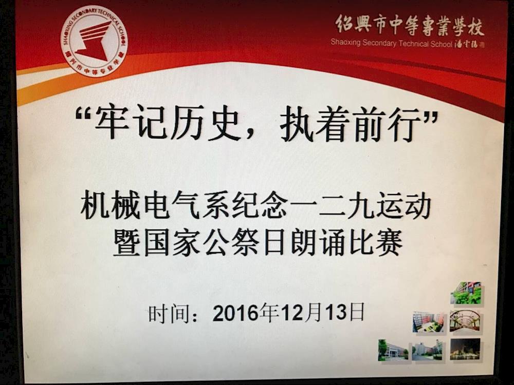 为了弘扬爱国主义精神,纪念一二九运动,1213日,机械电气系组织了以"牢记历史,执着前行"为主题的暨国家公祭日朗读比赛,机械电气系15个班参加了此次比赛。