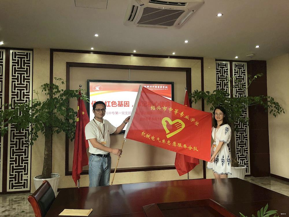 随后,第一党支部举行了“传承红色基因,党建带动团建”志愿服务队授旗仪式。校党委委员、副校长李金光向机械电气系团总支书记滕芳萍授予志愿服务大旗,吴丹萍等六位政治生日在六月的党员同志向机电系各班团支书授予班级志愿服务队队旗。