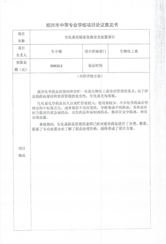 绍兴市中等专业学校【生物化工系实验室危废安全处置】项目的论证结果公告