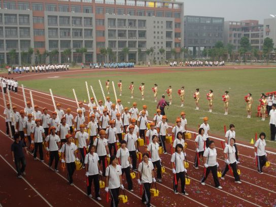 在嘹亮欢快的运动员进行曲中,分别走过了财电学区、建工学区、外语学区、化工学区和机电学区。他们正以整齐的步伐,军人的风采展现必胜的信心。他们精神激昂,口号响亮,预示运动会定会圆满成功。