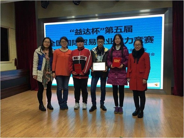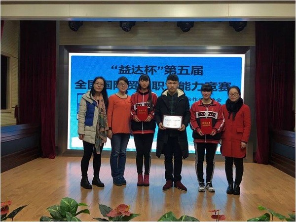 2015年12月20日,“益达杯”第五届全国国际贸易职业能力竞赛在上海举行。此次大赛由中国对外贸易经济合作企业协会和中国职业技术教育学会商科专业委员会共同主办,上海市商业学校承办。经过任李静、陈佳佳、李佳琴三位指导老师的用心辅导,我校两只参赛队伍表现出色,成绩喜人,分别荣获口业务操作单项技能一等奖、综合技能二等奖和三等奖。