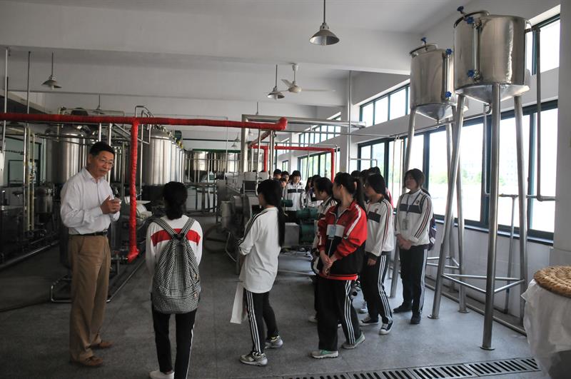 图为同学们在学院院长胡普信的带领下参观“黄酒生产实训室”