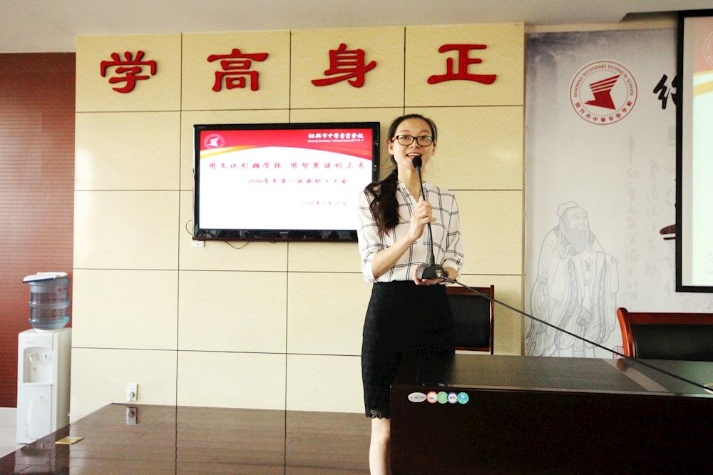 会议首先由王慧莉书记总结了学校教师暑期参加“平安志愿者”活动所取得的成绩。她强调新学期伊始,教职工要调整好自己的状态,关注教师形象,注意仪容仪表,以崭新的姿态和饱满的精神迎接学生的到来。紧接着,她部署了接下来几天的工作任务,并要求各部门和广大教职工要认真准备,严格落实,打好开学第一仗。之后,举行了新教师见面会, 2016年入职的9位新教师一一上台作了自我介绍,主席台上洋溢着青春的气息。王书记欢迎他们加入这个大家庭,她希望新教师们能勇于迎接挑战,做一个有理想有追求的教师,做一个脚踏实地的教师,做一个真心热爱教育、真心关爱学生的教师。