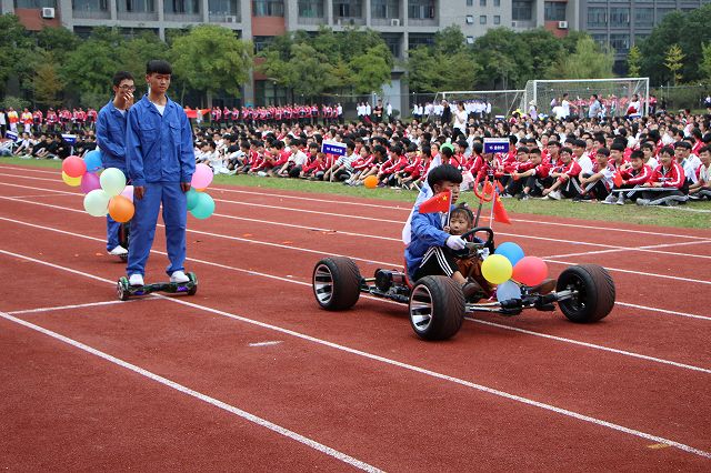 机械电气系学子驾驶自行装配的卡丁车进入会场