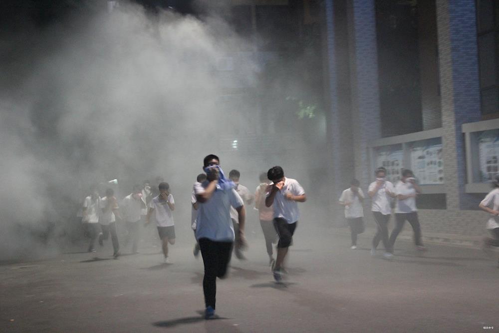 在掌握理论知识的同时,安监处协同教官组织住校生开展夜间消防安全突发事件应急疏散演练。演练前,教官动员学生熟悉疏散演练的程序、内容、时间和纪律要求,以及各个寝室疏散的路线和到达的区域,同时强调演练是预防性、模拟性练习,要注意防止发生演练中的伤害事故。晚上七点半,指挥长宣布演练开始,学生在各自寝室集合,做好相应准备,随着教官的哨声响起,同学们都用湿毛巾捂住口鼻,弯腰前行。疏散过程统一服从指挥,排成两列众队以最快的速度有序地撤离现场到和诚广场集合。