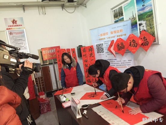 旅客朋友:请带上一份师生写的春联和“福”字,带着书法之乡人朴素的祝福回家吧!